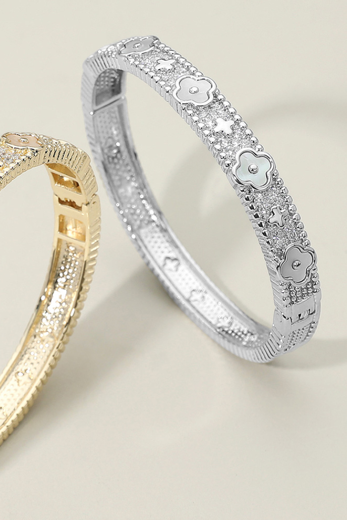 Polished gold-tone bangle with pave crystals and mother-of-pearl quatrefoil accents, the Quatrefoil Pave Bangle adds refined sparkle to any look. The slim hinged silhouette is detailed with textured edges and clustered stones for a vintage-inspired shimmer. This elegant bracelet is designed to layer beautifully with both casual and evening styles.