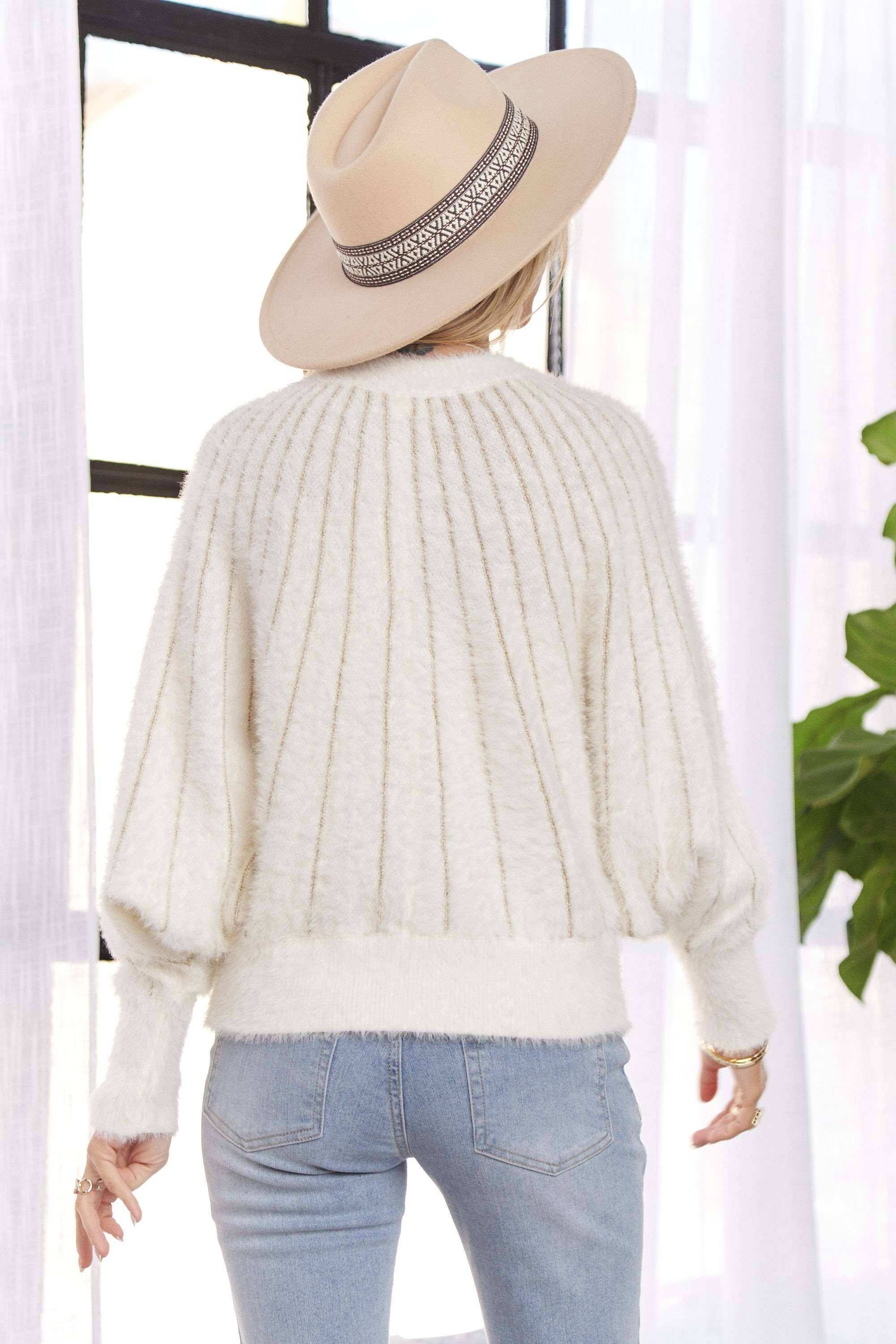 Cozy Lurex Striped Fuzzy Sweater in a soft, fuzzy knit threaded with metallic lurex stripes for subtle shimmer. This Cozy sweater features a mock neckline and relaxed balloon sleeves that create a modern, easy silhouette. Pair it with jeans for casual days or wear with a satin skirt for a holiday party