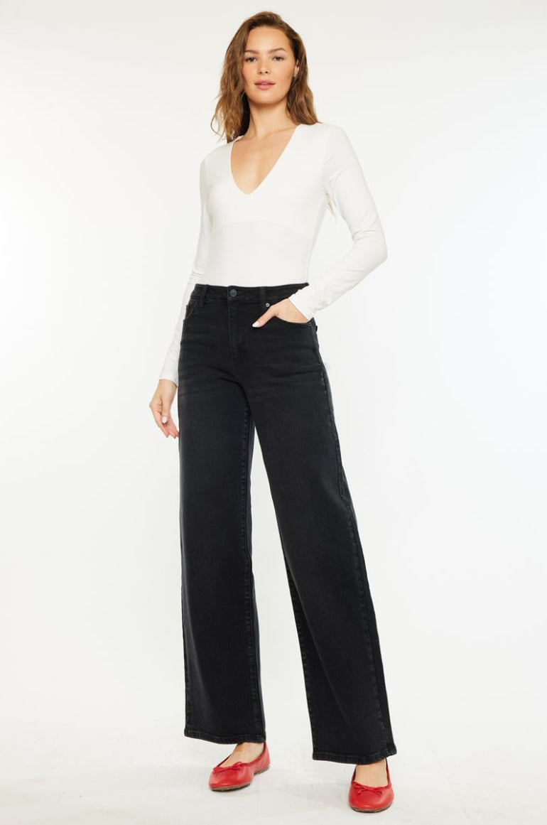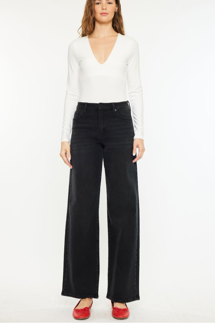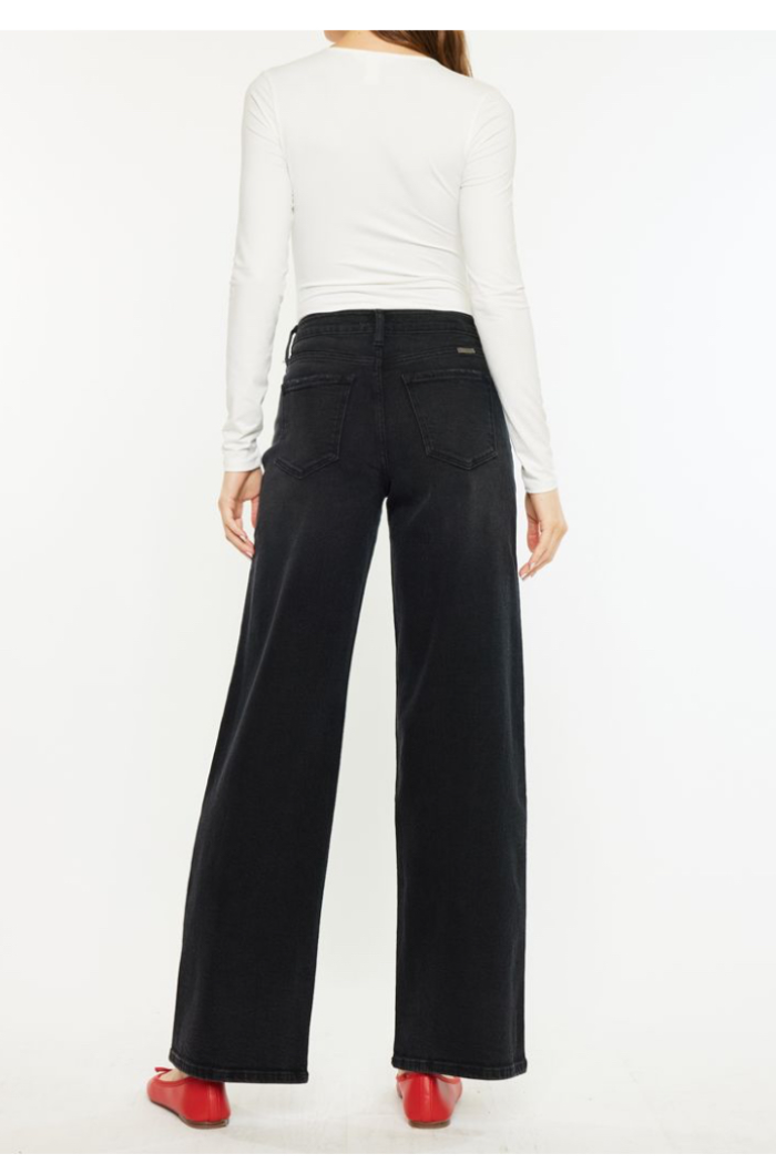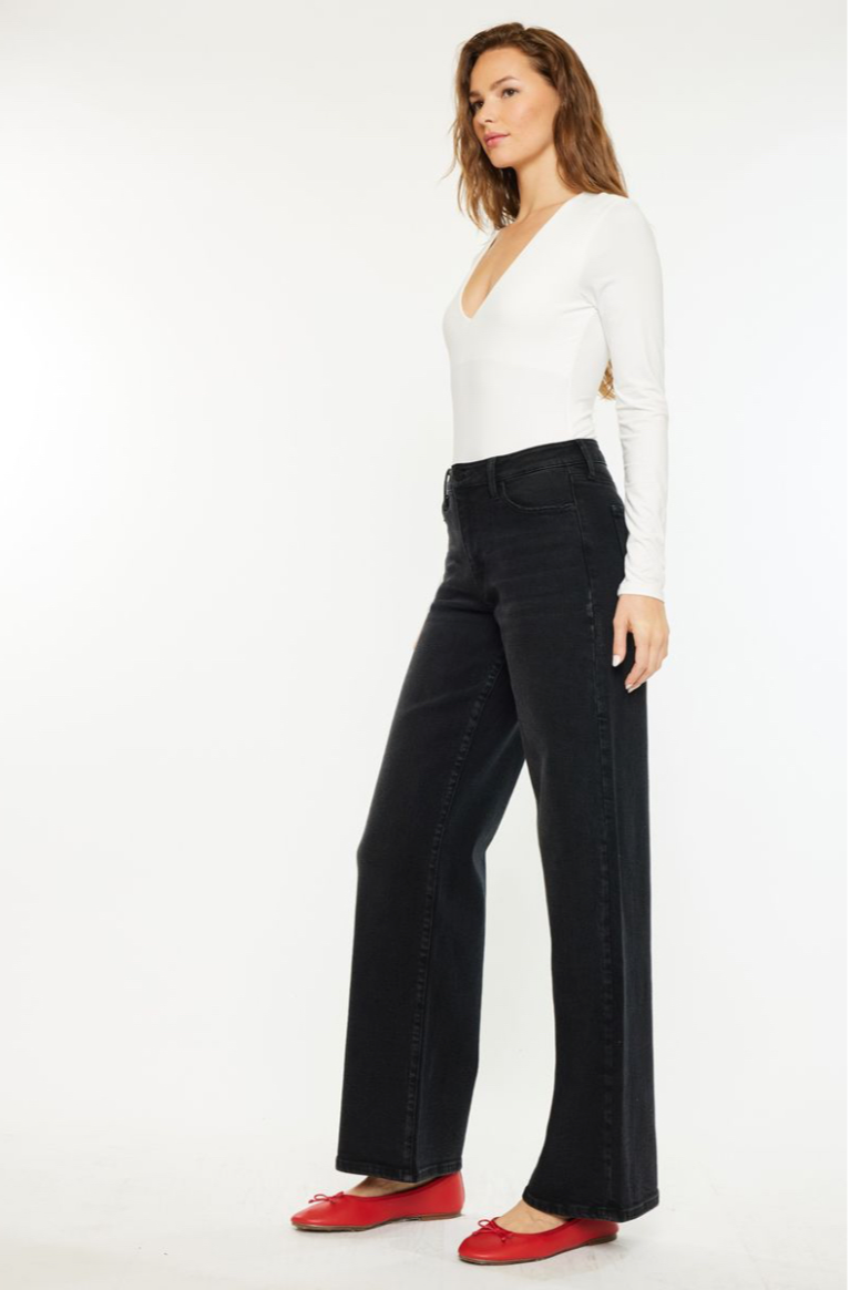 A modern take on a classic, The Dark Denim Jeans are high-rise, wide-leg denim that skim long over the foot for a relaxed silhouette. The Kancan design is crafted from dark washed denim with comfort stretch and a clean five-pocket finish. These jeans pair easily with fitted tops or a slouchy sweater for everyday, casual styling. Their long, floor-grazing length and structured waist give a polished-but-effortless look.