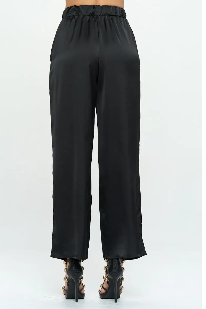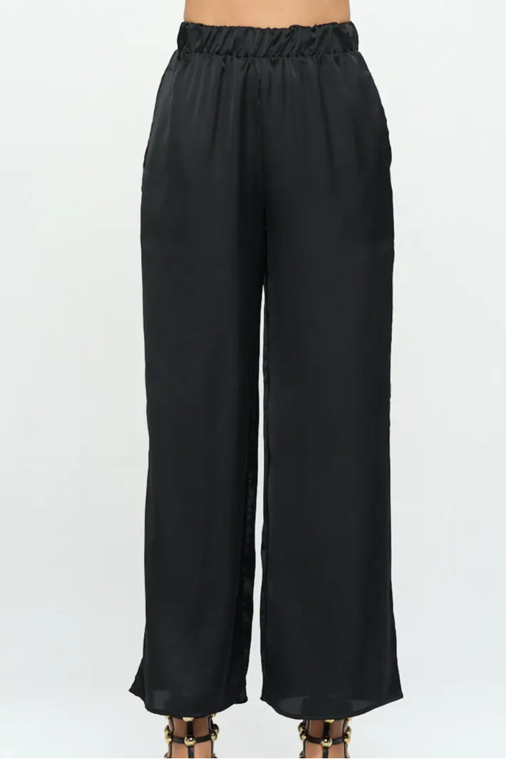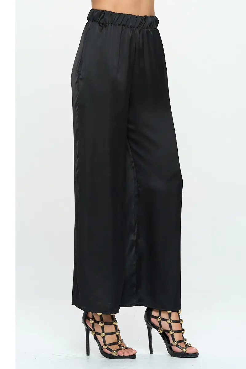 Smooth satin drapes through a relaxed, wide-leg silhouette for an effortlessly polished look. These Wide Leg Satin Pants feature a softly gathered elastic waistband and fluid black fabric that catches the light. Style them with heels for a night out or dress them down for a contemporary date-night ensemble.