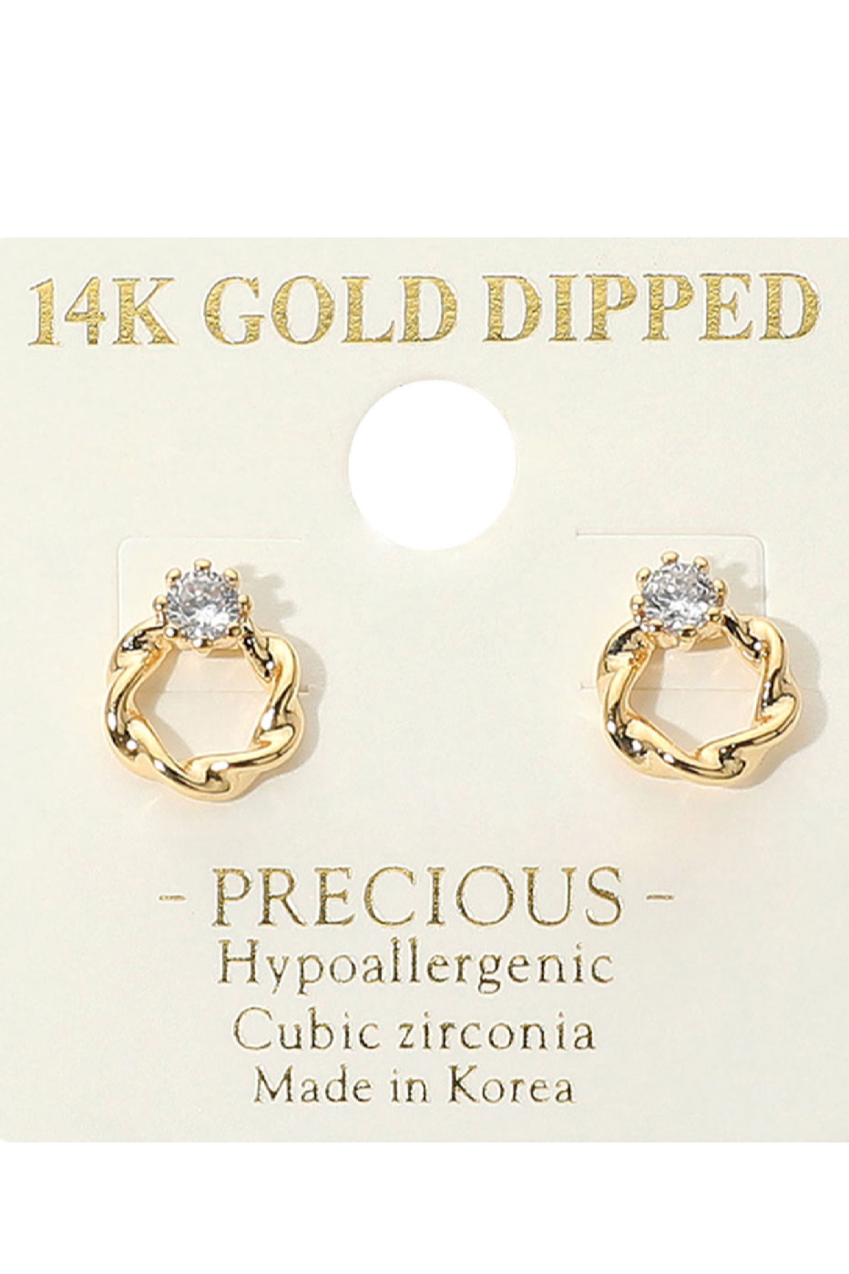 Delicate 14K gold-dipped cubic zirconia stud earrings with a twisted hoop accent add subtle sparkle to everyday looks. The 14K gold-dipped finish gives a warm, polished shine while hypoallergenic posts keep wear comfortable. These petite studs pair easily with both casual and dressy outfits for effortless refinement.