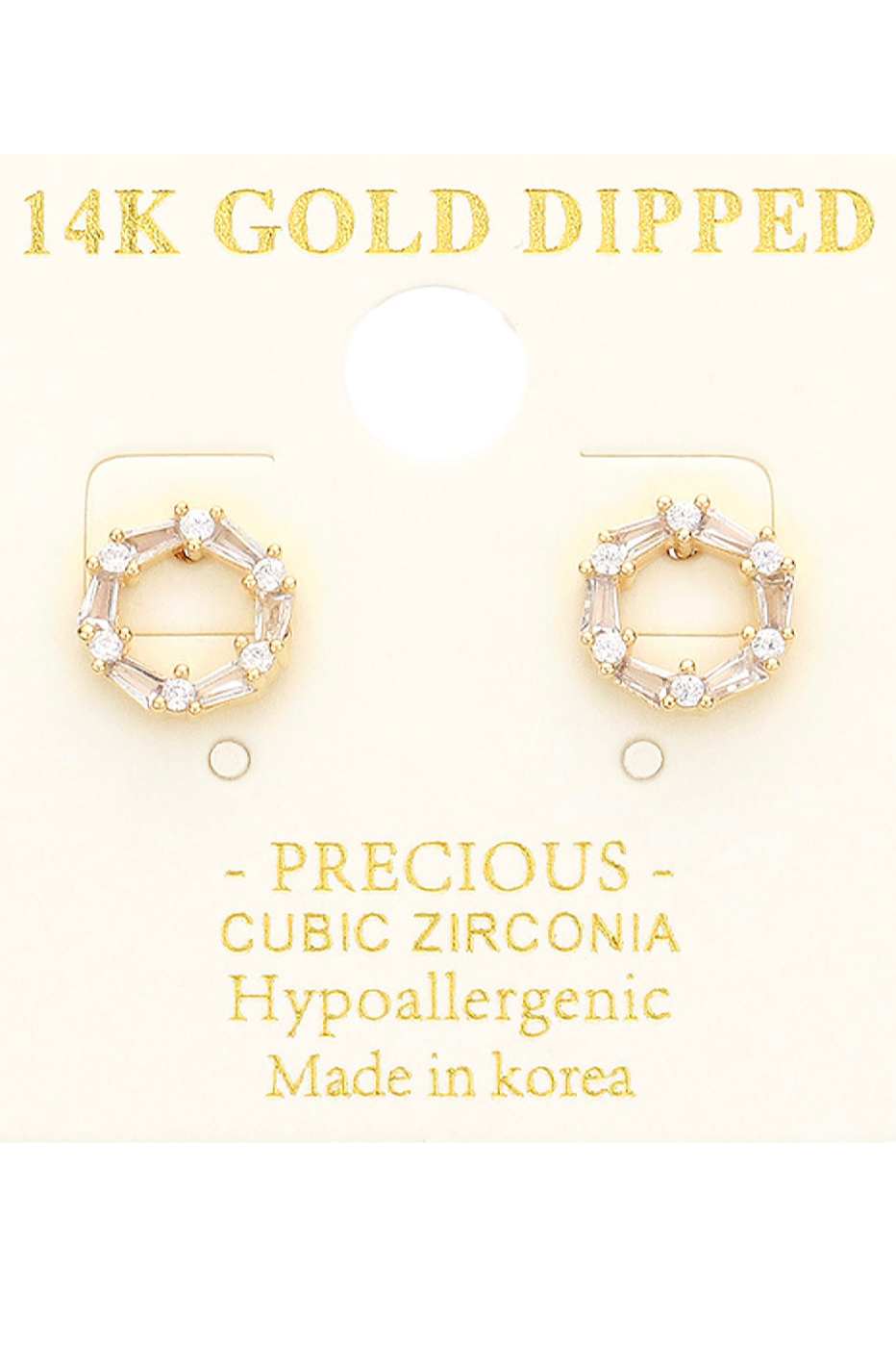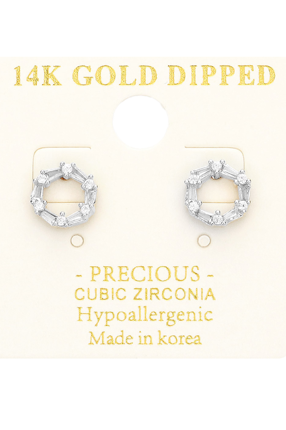 Delicate Gold Open Circle Studs bring a subtle sparkle to everyday looks with a wreath-like open circle set of baguette and round stones. The studs are gold-toned and feature clear cubic zirconia accents for a refined, lightweight finish. Wear them alone for a minimalist touch or pair with small hoops for layered ear styling.