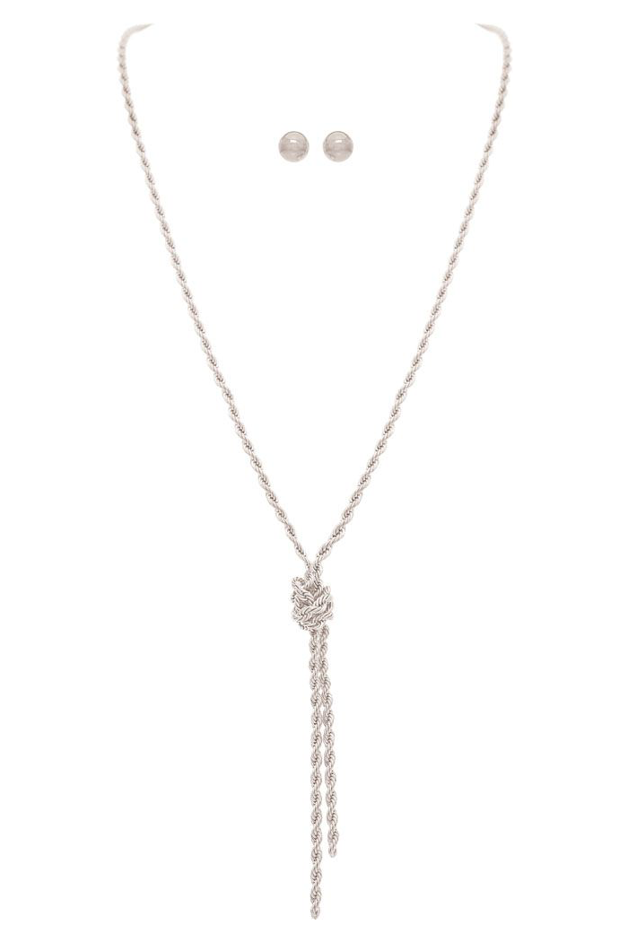 Solid Silver Knotted 3mm Rope Y necklace with Silver 5mm Ball Post Earrings