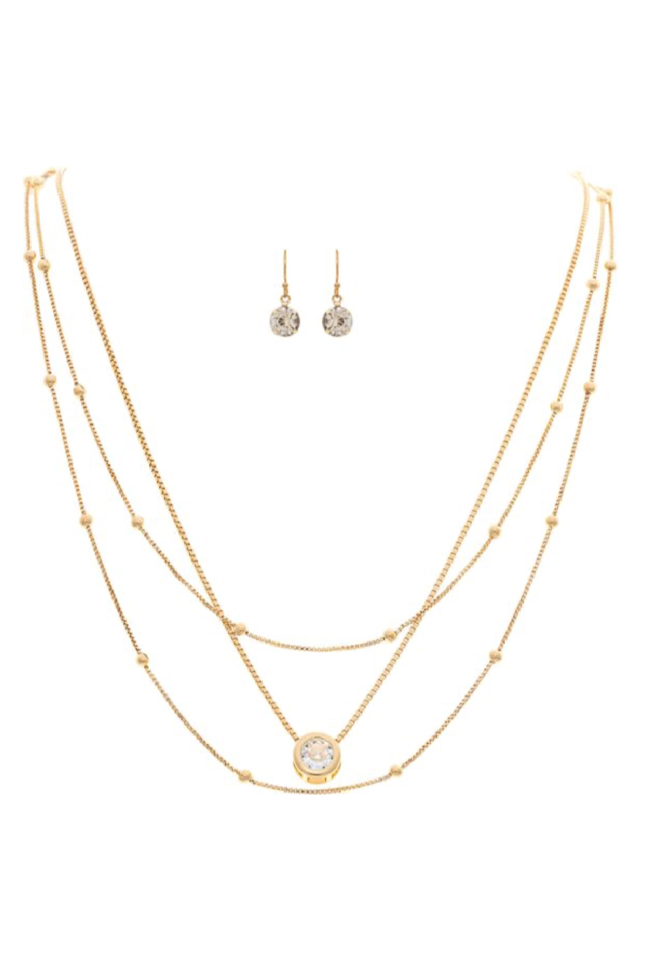 A delicate layered gold necklace with matching drop earrings for a coordinated look. The three-tiered necklace features fine box chains, tiny bead accents and a bezel-set crystal pendant that catches the light. Wear this layered pendant necklace and earrings set to elevate everyday outfits or add subtle sparkle for special occasions.