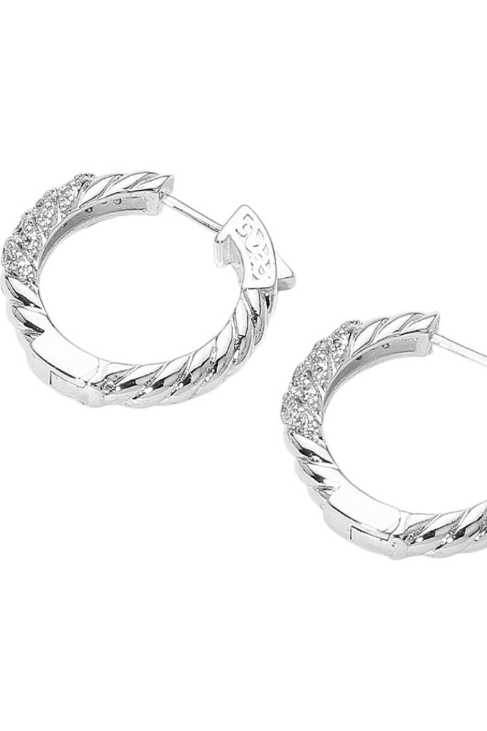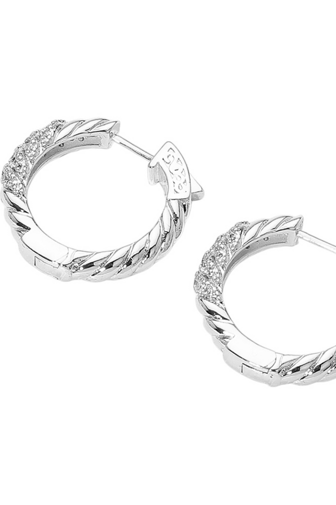 A pair of sparkling pave twisted hoops with a polished silver-tone finish for elevated everyday wear. The Pave Twisted Hoops feature textured twisted detailing and pavé-set crystals that catch the light from every angle. Secure lock backs ensure comfortable, reliable wear throughout the day.
