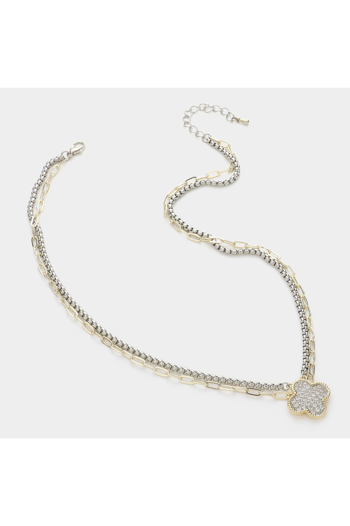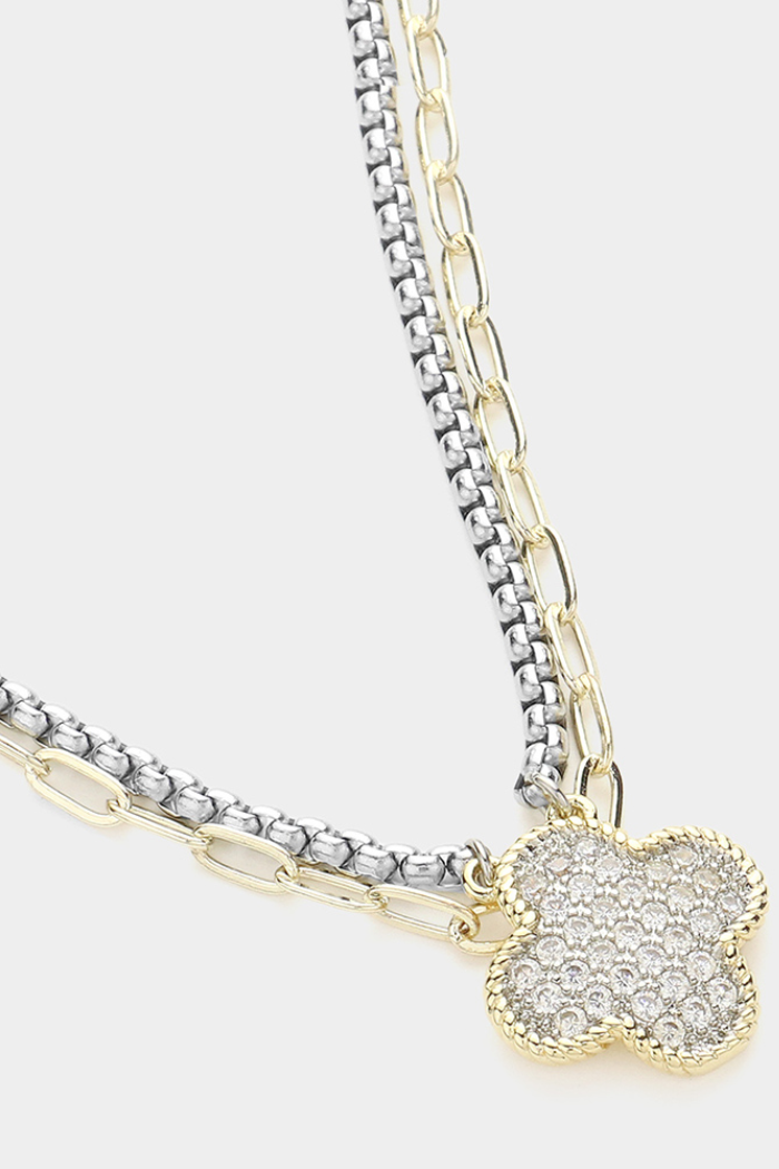Double Layer Silver and Gold tone Quatrefoil Clover Cubic Zirconia Charm Pendant Necklace