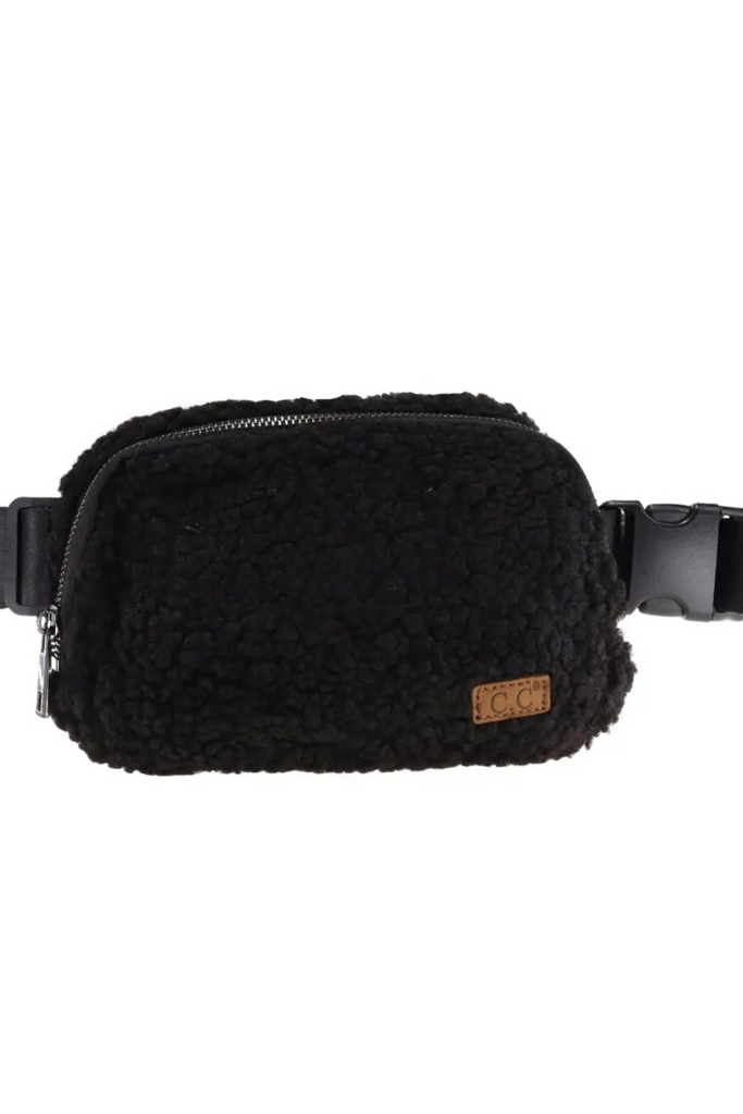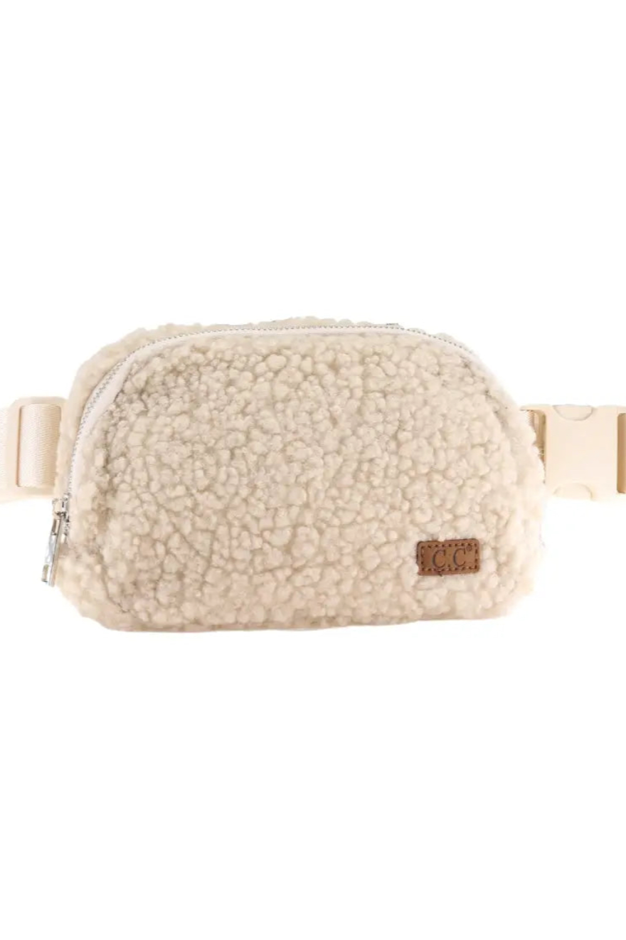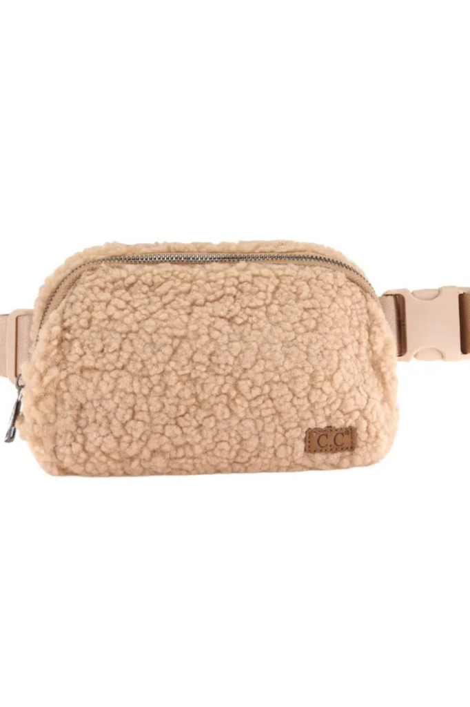 A cozy sherpa belt bag crafted for hands-free carrying with a soft, textured exterior and zip-top pocket. The Sherpa Belt Bag pairs casual warmth with easy wearability for errands and travel. Brand C.C. outfits the piece with an adjustable nylon strap and quick-release buckle for secure, comfortable styling. Its compact silhouette keeps essentials organized while adding an off-duty, tactile accent to layered looks. 8" x 5" x 2.25"