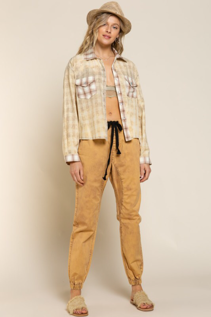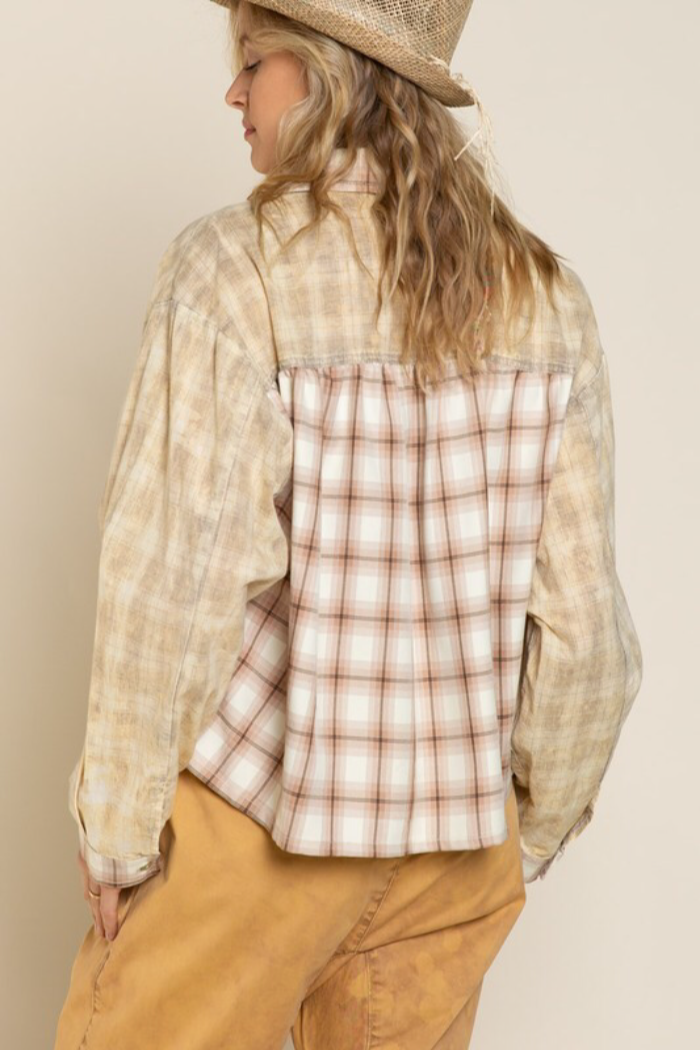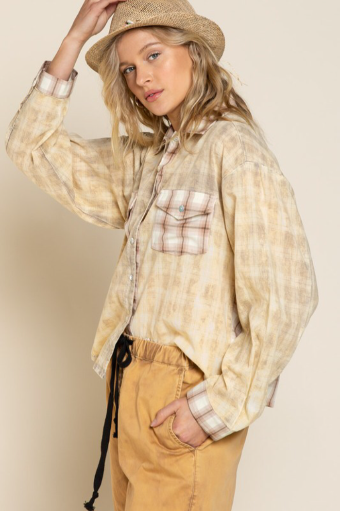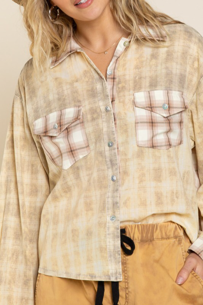 Distressed wash plaid top with collar, long sleeves with cuffs finished clean hemline, semi crop body length with relaxed fit. and featured in 2 different Plaid woven pockets