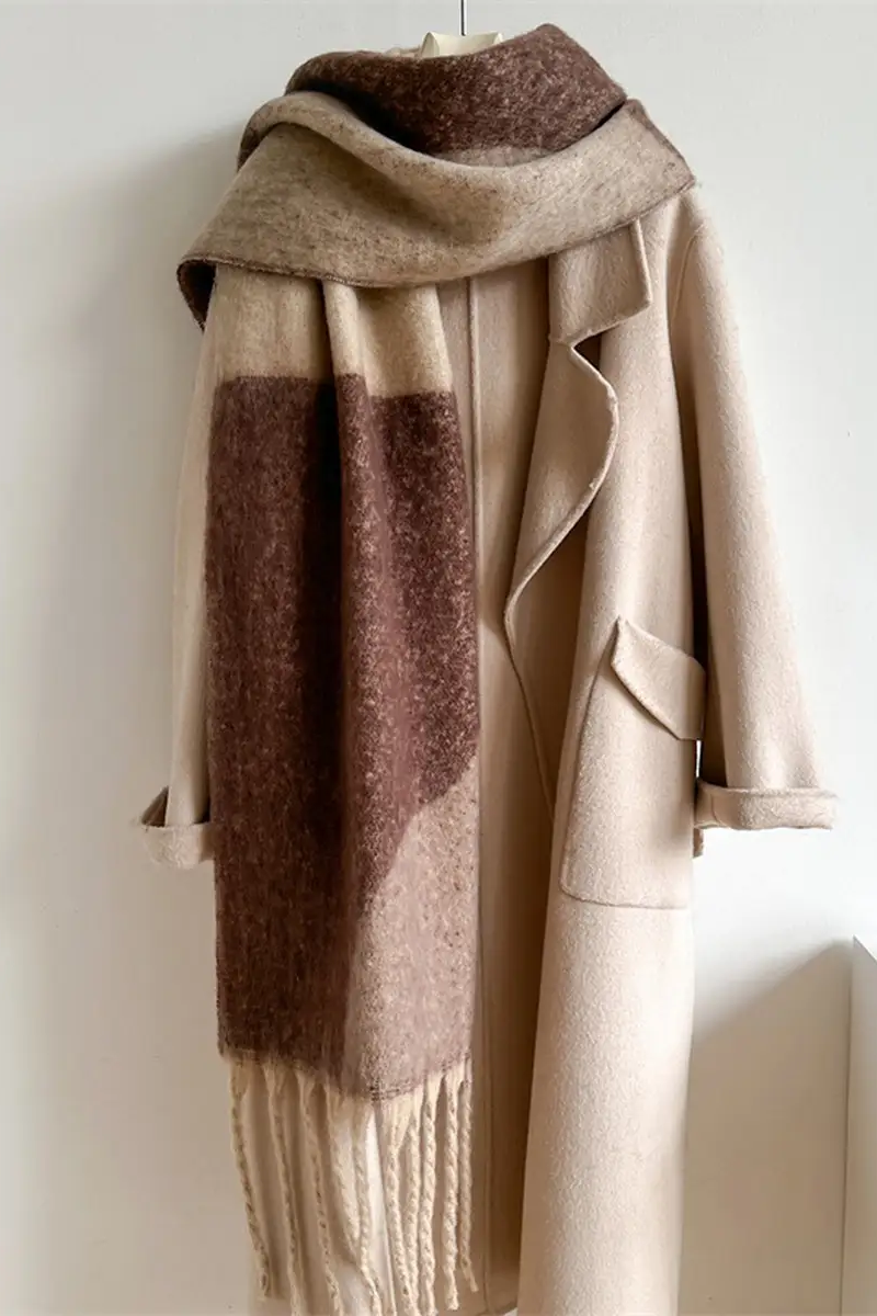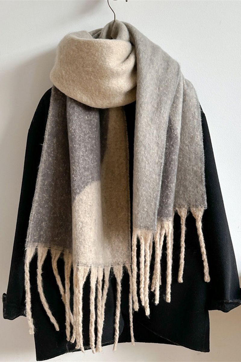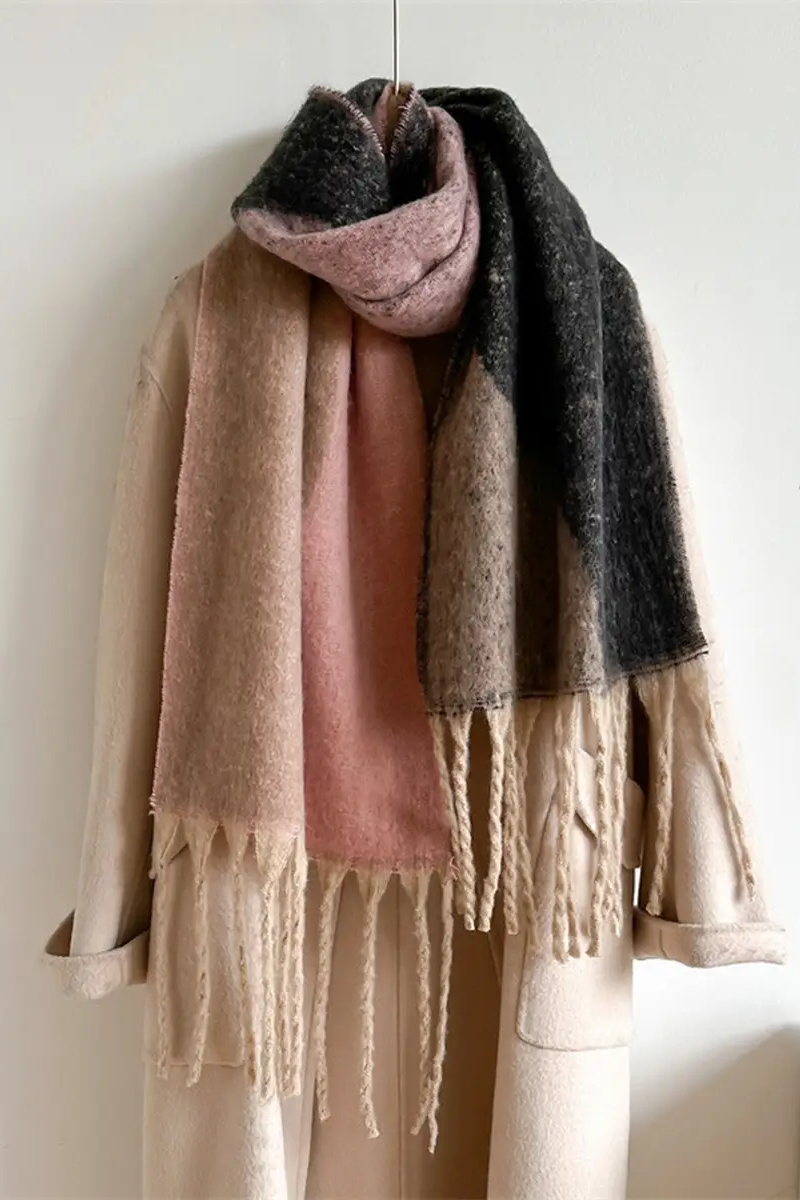 A cozy Geometric Multicolor Scarf with a soft, brushed texture and long twisted fringe for added movement. The colorblocked geometric panels blend muted pink, beige and charcoal tones for versatile layering. Ninexis designed this scarf to drape generously over coats and sweaters, offering both warmth and a modern, understated look.