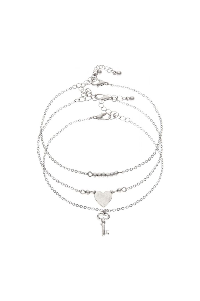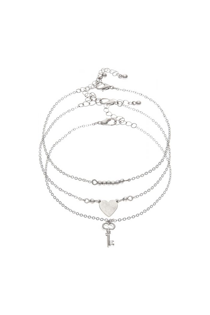 Adjustable Silver Heart Key Triple Anklet Set. 9”-11” inches