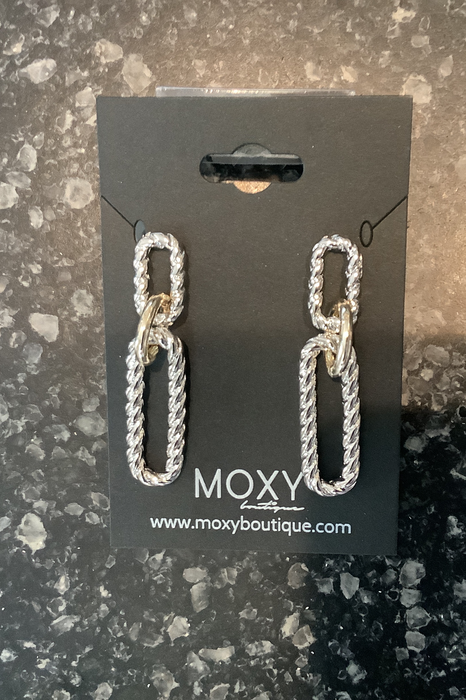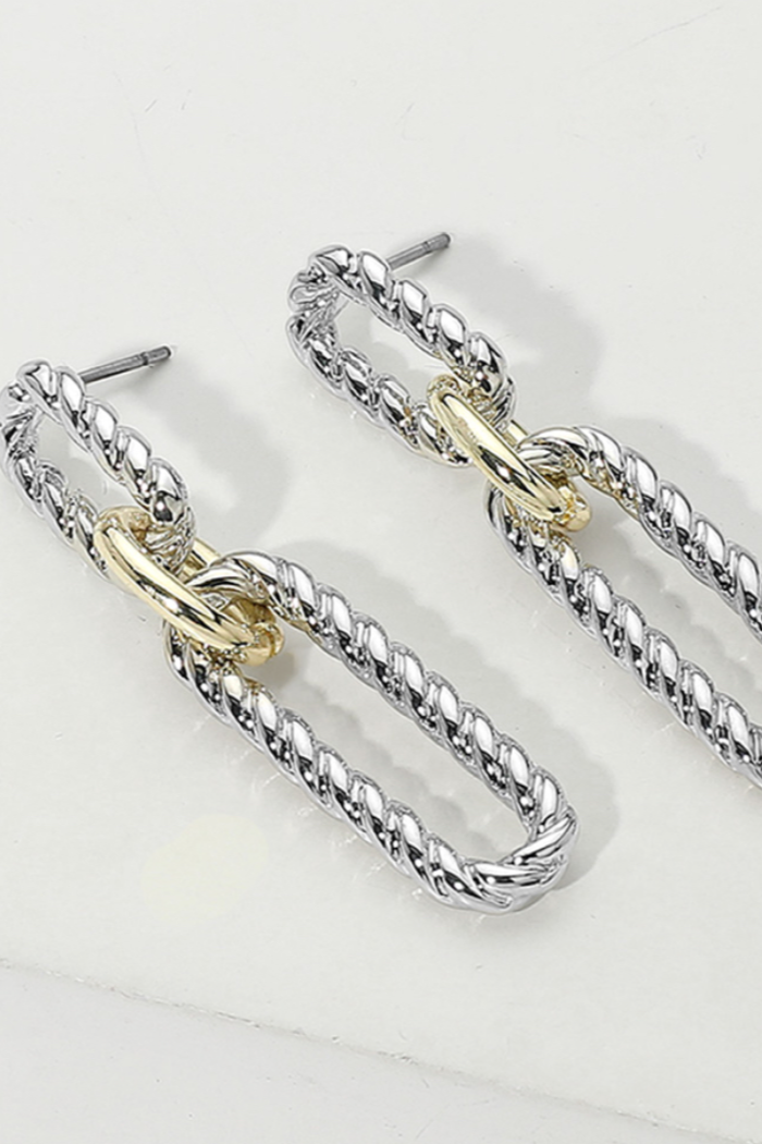 Long textured paperclip earrings with linked oval shapes and a twisted metal finish for subtle shine and movement. The Textured Paperclip Earrings are lightweight drop earrings that bring modern edge to day or evening looks. These earrings feature mixed-metal tones and bold elongated links for a contemporary statement.
