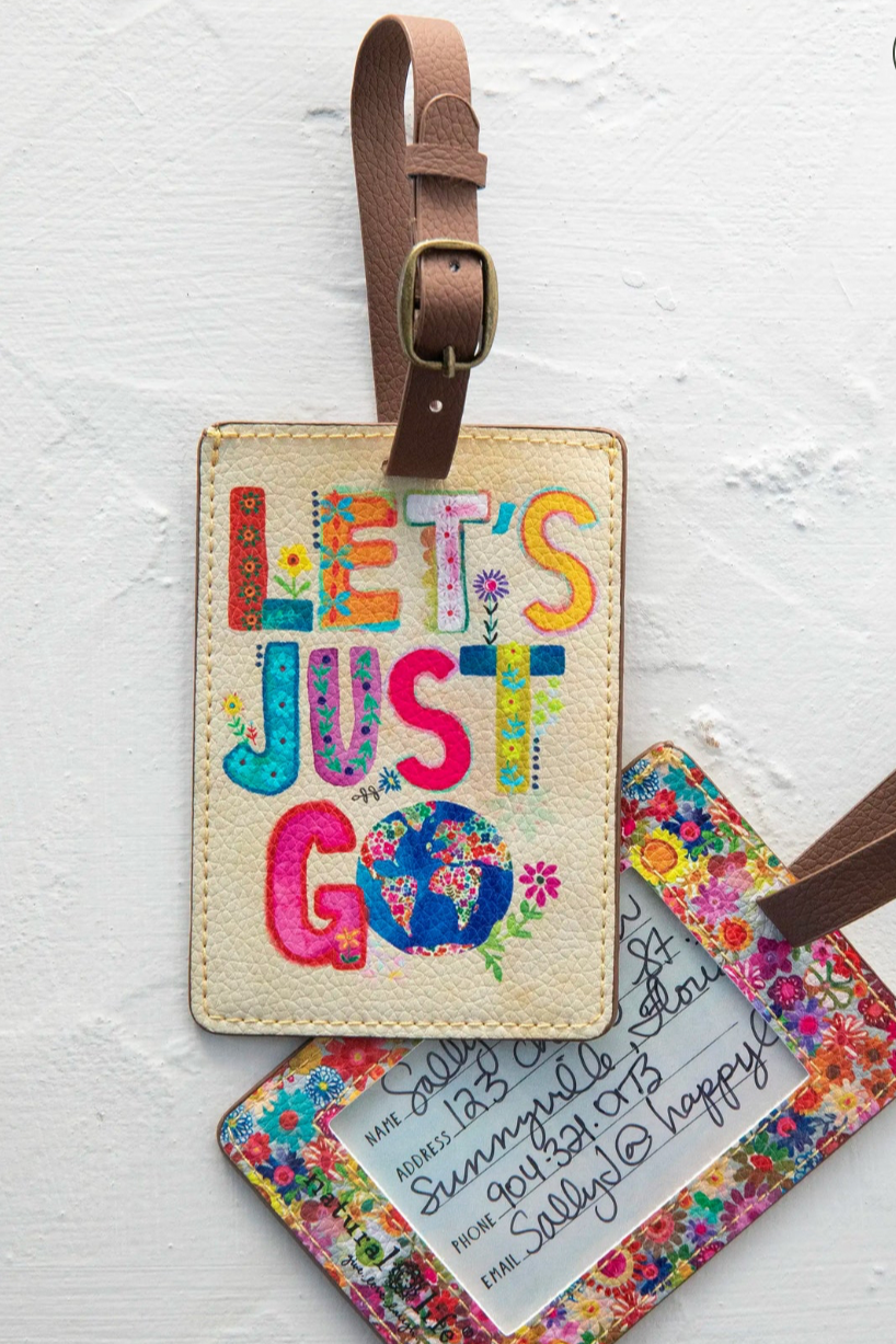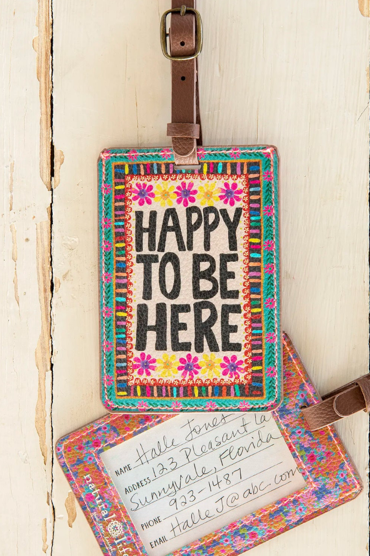 These Travel Happy Tags are a cheerful, printed luggage tag set designed to brighten any suitcase. The Natural Life tags feature a faux-leather strap, colorful floral artwork and a clear ID window for contact information. Lightweight and durable, they secure with a buckled strap and add a playful personal touch to travel gear. Perfect as a small gift or travel accessory, they make packing a little more joyful.